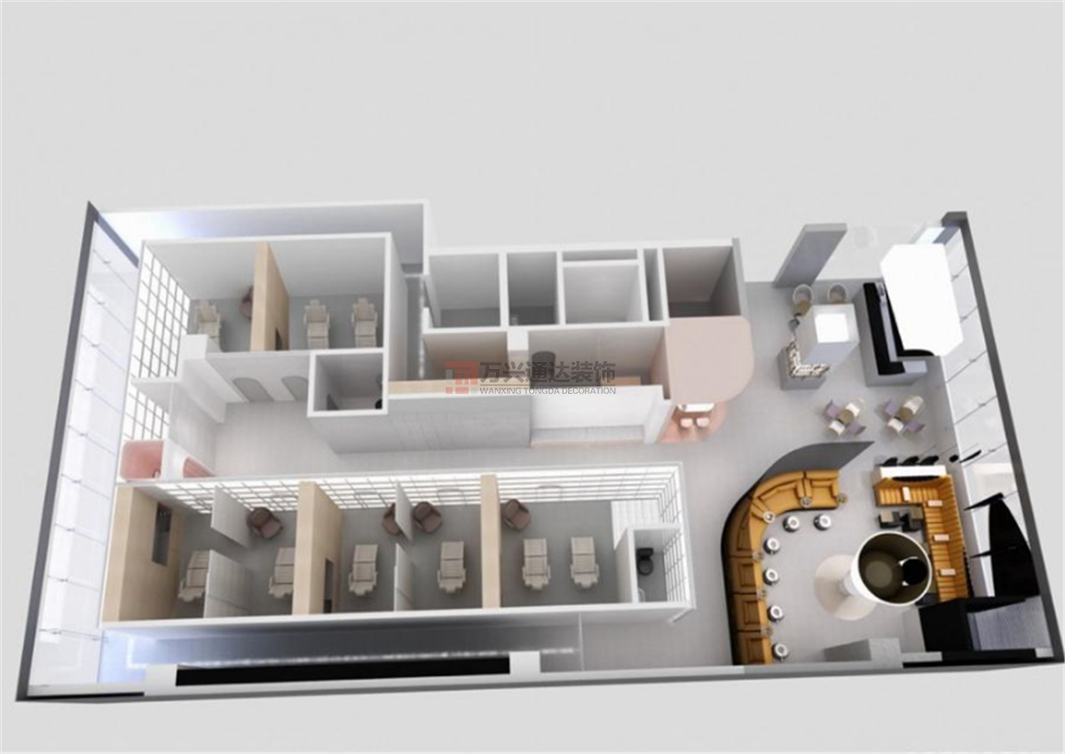 北京裝潢公司案例:外觀(guān)看來(lái)宛如長(zhǎng)形玻璃盒子的場(chǎng)域,里頭正施展著跨越時(shí)光的魔法,人們的時(shí)間像是被凍結(jié)(jié),悄悄地歸零后再重新啟動(dòng),揭開(kāi)個(gè)人熠熠的亮麗光采!接下空間規(guī)(guī)劃任務(wù)(wù)的構(gòu)(gòu)設(shè)(shè)計(jì)(jì),運(yùn)(yùn)用擬人般分割、變形及再造的手法,帶入現(xiàn)(xiàn)代女性既剛強(qiáng)(qiáng)又柔軟的兼容輪廓,讓專(zhuān)屬女性的醫(yī)(yī)療美容空間,不再那么冰冷有距離,反而如同一處偷閑的療愈境域般的存在。